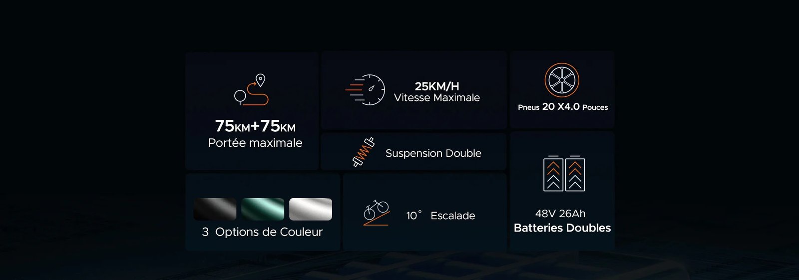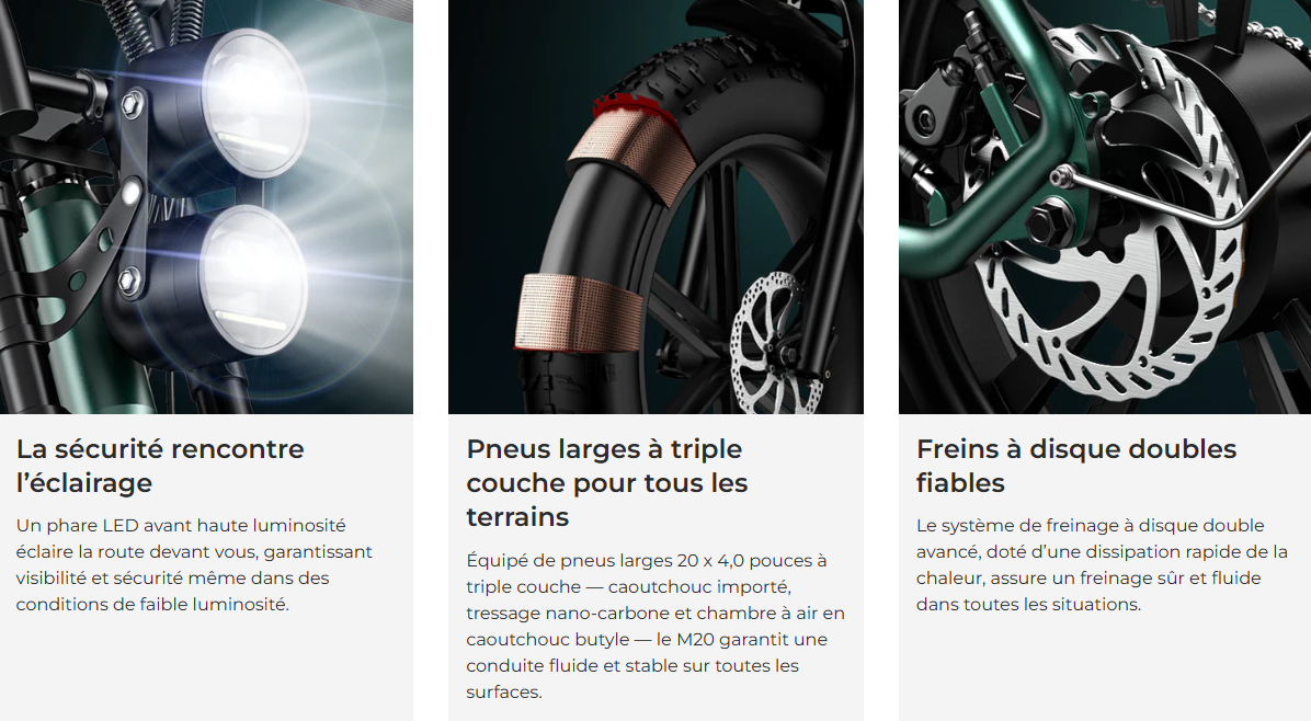 Son moteur brushless délivrant un couple de 55 N.m et une vitesse maximale de 25 km/h assure une excellente performance, même en montée jusqu’à 10°. Ses pneus larges de 20 x 4,0 pouces garantissent une adhérence optimale sur tout type de terrain, tandis que ses freins à disque mécaniques avant et arrière de 160 mm assurent un freinage fiable et sécurisant.